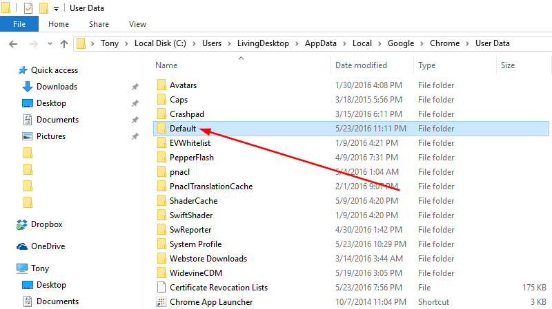 When you hit Enter, the File Explorer will open in the User Data folder of the Google Chrome browser. There you need to find the Default folder and select it. Now press the keys Shift + Del to remove the folder permanently from your computer.